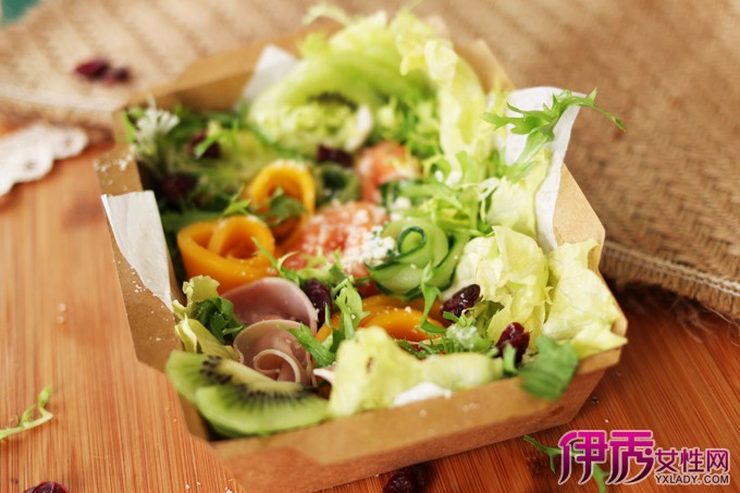 制作沙拉的原材料完全可以根据自己的喜好进行选择。这款鲜花盒子沙拉就用了苦菊、包心生菜、青瓜、芒果、奇异果、三文鱼、火腿片和蔓越莓干。可以说是相当丰盛啦。