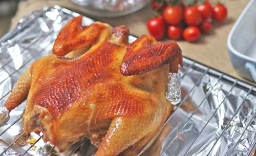 有了烤箱,但又懒得用来做烘焙,那么平时用来烤烤各种肉肉就很不错啦。做一只皮脆肉嫩的脆皮烧鸡原来这么简单。学会了之后宴客的时候露一手,保证技惊四座。想要烤出口感脆薄的鸡皮,需要两个窍门。第一,腌制完毕后把鸡皮擦干净,用吹风筒把表皮彻底吹干。冷风热风均可,但要吹好一阵子,所以推荐冷风吹。第二,入烤箱前,用黄油涂抹鸡皮。另外,进入烤箱后一般使用180度来烤。但因为不同烤箱的热度有差,所以最好还是根据自己的烤箱性能以及鸡的大小进行调节。烤的时长一般为30到40分钟,但也需要根据实际情况进行调整。如果平时使用烤箱的次数多,熟悉自家烤箱性能的,就会觉得这道菜非常简单方便了。