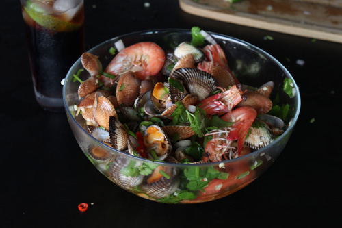 热到喘不过气来的日子,强力推荐凉拌海鲜这道菜。色彩缤纷充满了夏日气息,加上青柠檬汁和鱼露,增加了一点异国情调。同时高蛋白低脂肪,也是十分健康的菜式。