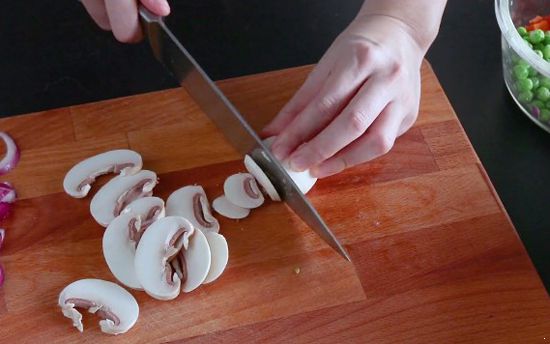1 洋葱、红萝卜、午餐肉切粒。蘑菇切片。虾仁、蟹棒洗净备用。
