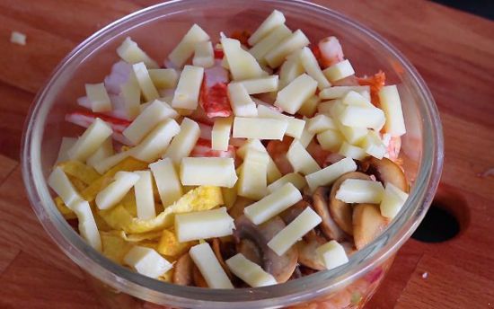 5 把虾仁、煎好的蘑菇片、蛋丝、蟹棒分别在炒饭表面呈扇形码好,再均匀撒上一层芝士。芝士爱撒多少撒多少,喜欢吃的多撒。