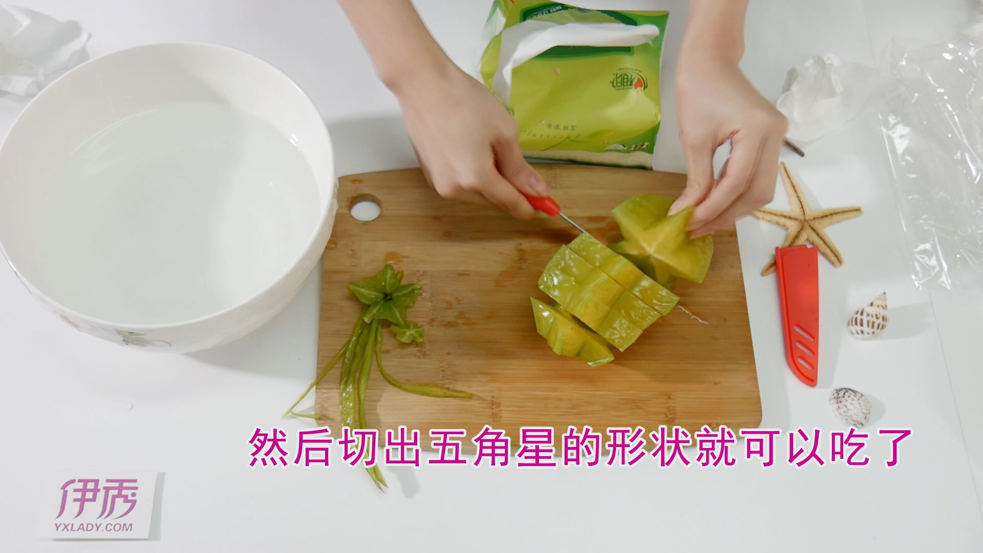 用纸巾先擦一次杨桃外皮,去除表面灰尘。将杨桃放入水中清洗,每个角落都要清洗干净,用纸巾抹干水分并擦干净,将杨桃的五个边用小刀去除掉,头尾去除掉一部分,然后切出五角星的形状就可以吃了。