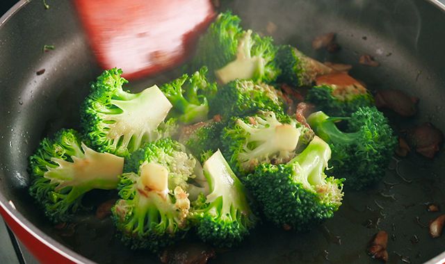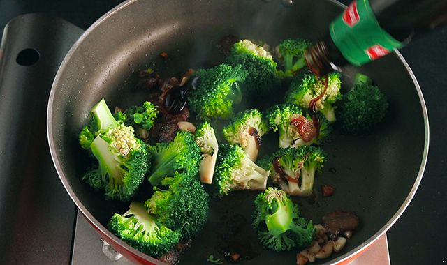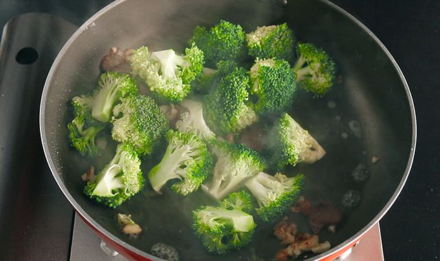 热锅下腊肉,爆出油后下蒜粒炒香,下西兰花,略翻炒。