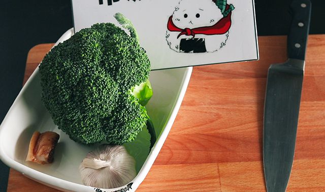 准备食材:西兰花、腊肉、蒜头,生抽、料酒、耗油。